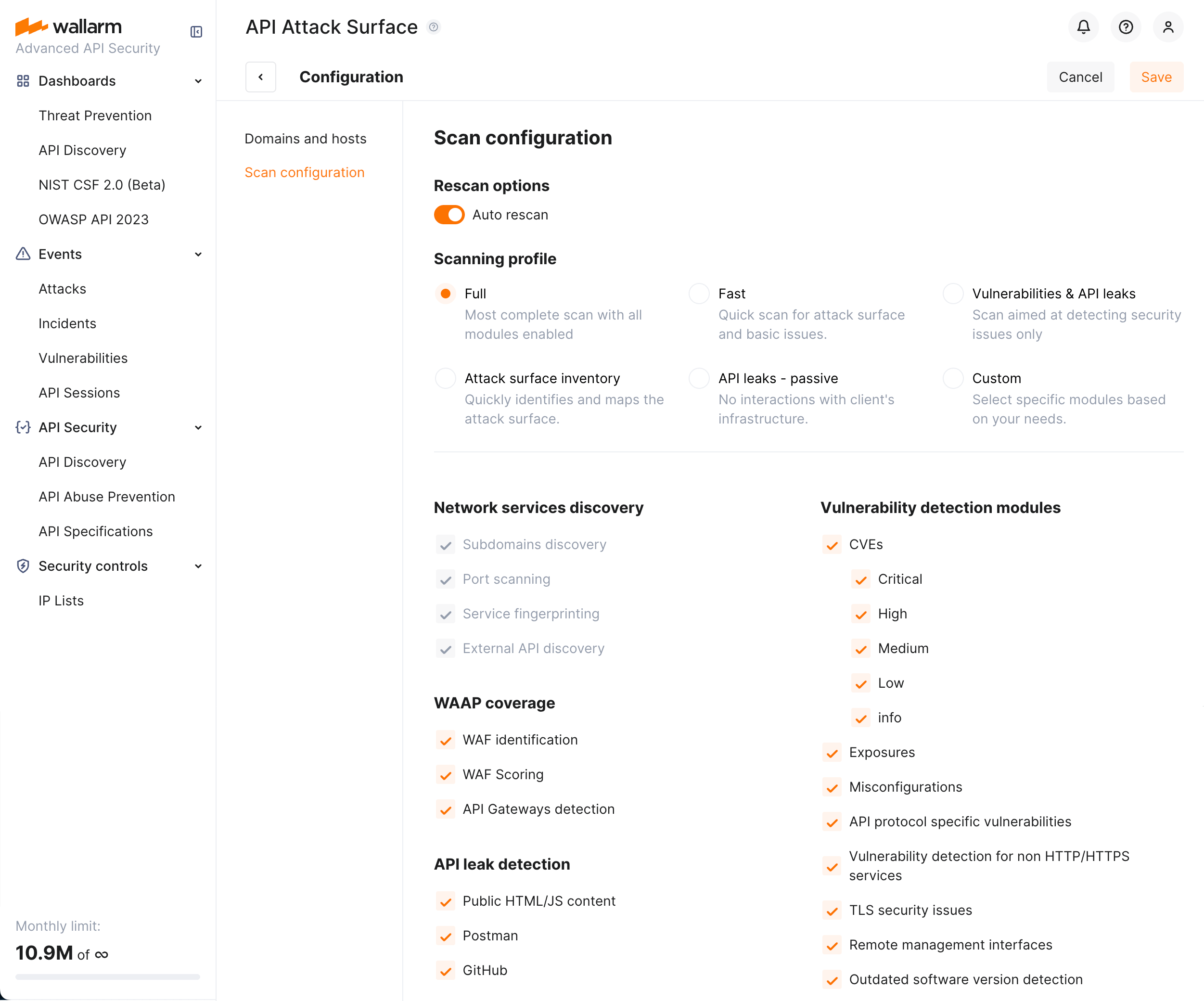 | Full | Most complete scan that searches for all types of network services, fully checks WAAP coverage, searches for API leaks by all possible ways and has all vulnerability detection modules enabled. |